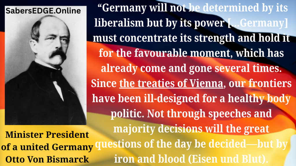 The position of Prussia in Germany will not be determined by its liberalism but by its power […] Prussia must concentrate its strength and hold it for the favourable moment, which has already come and gone several times. Since the treaties of Vienna, our frontiers have been ill-designed for a healthy body politic. Not through speeches and majority decisions will the great questions of the day be decided—that was the great mistake of 1848 and 1849—but by iron and blood (Eisen und Blut).
