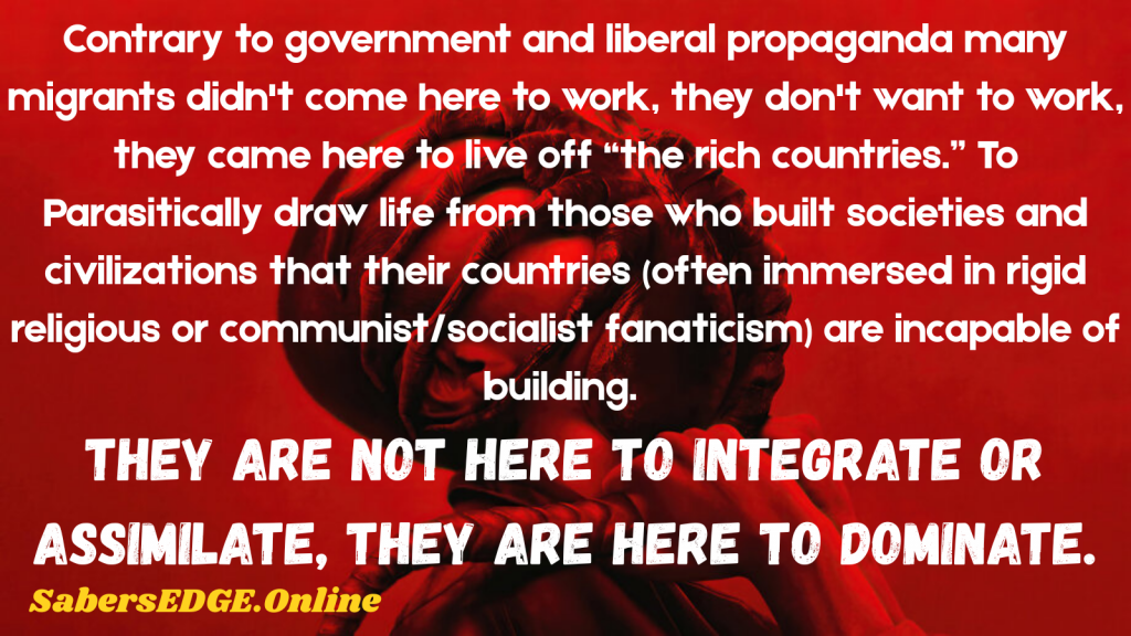 Studies accomplished in Holland have shown that if the first generation of immigrants are dependent upon government handouts and become an overall drain on national resources, the second and third generations of those migrants continue to parasitically draw their lively-hood from the good working people of the nation by deflecting tax revenue that could be making the nation stronger and safer for loyal citizens. This is endemic in their unassimilated cultural attitudes; they don’t have the famed “protestant work ethic” that built Western Civilization. Contrary to government and Leftist propaganda they didn’t come here to work, they don’t want to work, they came here to live off “the rich countries.” They want those who built this civilization to give them handouts and feel sorry for them because they didn’t build a civilization in their own country worth staying in – often because their own countries are so immersed in tribalism, Marxism, or religious fanaticism that they are incapable of building a safe and stable society such as Western Civilization has built. They have been taught by Neo-Marxist propaganda that if someone is rich it is because they stole it…pure Marx/Engels/Lenin/Trotsky. They are not here to integrate or assimilate they are here to dominate.
